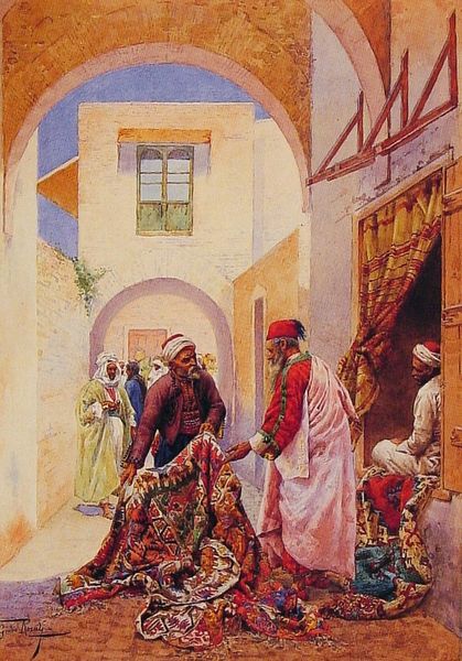 Jean-Léon Gérôme painted The Carpet Merchant of Cairo using oil on canvas. At first glance, the dense composition and rich, earthy colors envelop us in a bustling Cairo marketplace. Notice how Gérôme masterfully uses light and shadow to create depth, drawing our eye to the merchant at the center, laden with carpets. His figure, adorned with textiles, contrasts with the muted tones of the surrounding architecture and the softer hues of the background crowd. Gérôme, deeply influenced by Orientalism, meticulously reconstructed scenes from the Middle East, reflecting a fascination with its exotic allure. Here, the play of textures, from the rough stone of the buildings to the intricate patterns of the carpets, invites us to consider the relationship between the material and the cultural. This contrast challenges fixed notions of the Orient, inviting re-interpretation of cultural representation. The painting becomes a site where visual form intersects with broader discourses of cultural encounter, prompting us to question how we perceive and interpret other cultures.