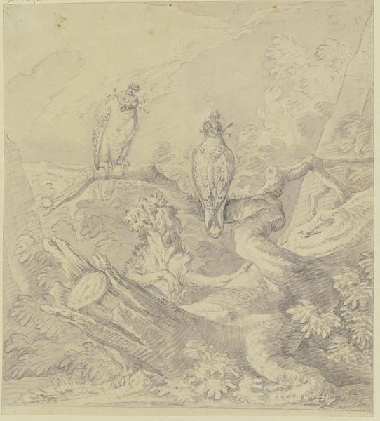Lorenz Frølich sketched this mythological scene, along with landscapes and figures, using pen and watercolor. Born in Copenhagen in 1820, Frølich's art often drew from Norse mythology and historical themes, reflecting the rising tide of nationalism in 19th-century Europe. His work provides insight into how cultural identity was being constructed and celebrated during this period. The figures in this sketch, with their classical poses and idealized forms, signal a longing for an idyllic past, while the medium reflects contemporary trends in art. Consider how Frølich might have been envisioning a return to a 'pure' cultural heritage, even as his artistic style kept him firmly rooted in the present. This piece acts as both a personal artistic exploration and a broader commentary on cultural identity.
