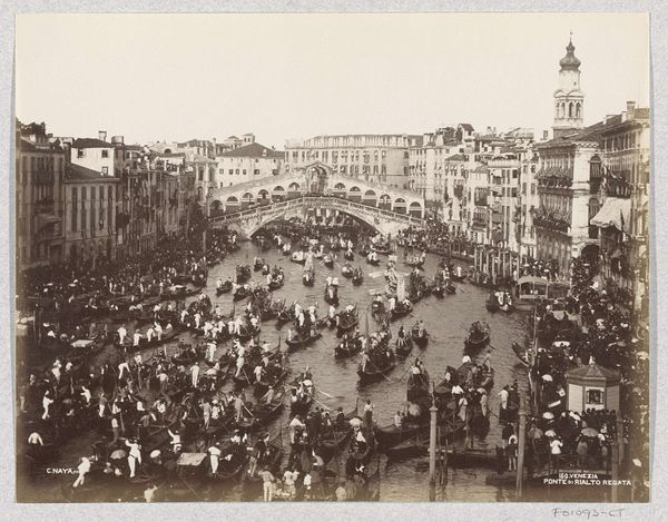Editor: This is a gelatin-silver print from 1898 by Fratelli Alinari, depicting the Chiesa di San Pietro in Banchi, in Genoa. It's fascinating how the church is situated right in the heart of the bustling city, yet maintains its architectural grandeur. How do you interpret this work, considering its historical context? Curator: It's interesting to see this photograph as more than just a document of a specific location. Alinari, by capturing this scene, participates in the wider visual culture that shaped perceptions of Italian identity in the late 19th century. What do you notice about the people in the photograph and their relationship to the architecture? Editor: There's a large crowd in the square, seemingly going about their daily lives. It's a very dynamic composition, contrasting the static architecture with the movement of the people. The Church is undeniably prominent, even if enveloped by these mundane daily happenings. Curator: Precisely. These urban scenes became symbols of national pride but also showcased the rapid transformations Italy was undergoing. Consider how the rise of photography impacted the representation of cities and their monuments. Before its advent, paintings, engravings, or even oral storytelling determined representation, and that narrative was reserved to only a privileged elite. What's interesting here is how a space for commercial transactions – there are shops at ground level here – became associated with civic identity through photographic images, isn't it? Editor: It's true. The accessibility of photography democratized image-making and opened it up to new social dynamics. I hadn't really considered that photography has shaped our sense of collective identity. Curator: And the image circulated widely, influencing understandings of Italy. The everyday now has potential for memorialization, shifting the balance from historic and aristocratic narratives toward one accessible to a greater number of people. That makes it a really valuable contribution in the social history of image-making!