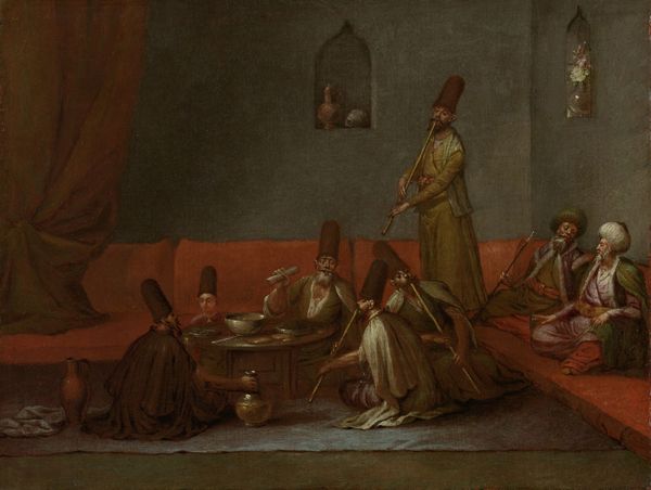 Editor: Here we have Jean Baptiste Vanmour’s "Lying-in Room of a Distinguished Turkish Woman," painted in the early 18th century using oil paints. What immediately strikes me is the composition; it’s a scene teeming with figures, yet there’s a stillness, almost a tableau vivant quality to it. What do you see in this piece from a formalist perspective? Curator: Indeed, the painting presents a compelling arrangement. If we analyze the picture solely by what is represented, it is easy to miss that its strength exists because of its balance and pictorial arrangement. The color palette, largely subdued greens, reds, and golds, creates a harmonious whole, with a very gentle modulation between those local areas. Observe, too, how the composition directs our eye from the left foreground towards the central figure on the bed, achieved through subtle gradations of light and shadow and implied linear relationships. The material handling is exceptional and precise. Editor: The way the artist employs a lot of details on a small plane gives a rather artificial sense. Could we say the scene looks like it was constructed carefully with meticulous consideration? Curator: Precisely. Vanmour manipulates pictorial space and planes to flatten the depicted scene. This is one way the viewer has access to understanding that its symbolic and iconic components exist above historical realities. There is no spatial "realness". And you see that he utilizes color, as an independent device, rather than an actual physical component, to define it as a picture first, rather than, necessarily, a painting. Editor: That’s fascinating, looking beyond the subject to appreciate the pictorial logic within the artwork. Curator: That's formalism—engaging with art through its internal structures. Consider the arrangement, its forms, colors, and lines—it offers a unique access point of perception.