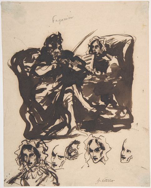 Editor: This is "Character Study," a drawing made with ink and pen attributed to Alfred Dehodencq. It looks like a collection of studies. There are different faces, figures, some religious imagery... The overall effect is quite intriguing but a little somber. How do you interpret this work? Curator: It’s a fascinating sheet of studies, isn’t it? I see Dehodencq engaging with archetypes. Look at the juxtaposition of the contemplative portraits with the monk in prayer and the memento mori imagery. The skull is not simply about death; it signifies mortality and the necessity of ethical considerations. How do you see that playing out? Editor: I see what you mean. It feels like Dehodencq is wrestling with themes of piety and self-reflection, and maybe also with the inevitability of death. I guess, I had not quite thought of the faces as portraits; they have a universal feeling to them. Curator: Precisely! They are "character studies" suggesting a social hierarchy with figures absorbed in thoughts but placed near symbols of morality and consequences. Notice how this placement creates a tension: the figures look inward while existing near stark reminders of their actions and potential legacies. This relates to larger power structures. Where do you see these represented here? Editor: Perhaps in the positioning of the religious figures above the others? It seems to emphasize the Church’s traditional role in shaping thought. Curator: That's insightful. Dehodencq is showing how such influences touch every layer of society, regardless of status. Also note the gaze in those figures. Is it condemning, inviting, or perhaps something else? Editor: It could also just be…observational. The artist presenting society. The viewers are the ones to judge? Curator: An astute reading! It turns the gaze back onto us as viewers. A demand for us to be active participants and self-aware as we engage in this social drama, questioning our roles. What is one question this drawing leaves you with? Editor: I'm left wondering, is Dehodencq critiquing or simply illustrating society? Thank you; this gave me a lot to think about! Curator: It challenges us to confront these questions actively.