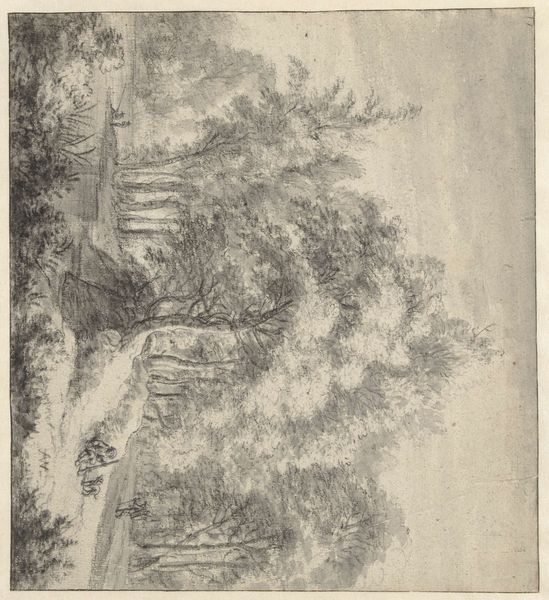 Curator: The Art Institute of Chicago holds this drawing by Gaspard Dughet, "View of Ruined Arches and Tomb in Villa Borghese." It's an interesting piece. Editor: Yes, the sepia tones give it an immediate air of aged elegance, almost melancholic. It feels like looking at a faded memory, or an architectural rendering awaiting approval. Curator: Indeed. Dughet was known for his landscape paintings, but this drawing showcases his skill with layered washes of ink and gouache. It makes me think of the sheer volume of material—paper, ink, the labor itself—involved in capturing these views, translating the experience of a specific location into a commodity for a patron's enjoyment or study. Editor: And consider that location: Villa Borghese, a space of elite leisure, appropriated by artists and then circulated as imagery. This artwork really underscores how landscapes were transformed into objects of cultural capital, displayed within collections, shaping perceptions of both nature and social status. Think about who this was made for, and how it informed their experience. Curator: Precisely! I'm intrigued by how Dughet utilized preliminary sketching in pencil or graphite underpainting here, before layering on the wash, creating this very detailed scene. And how those technical aspects then inform our understanding of artistic labor at the time. Editor: And the ruins themselves – not just picturesque, but signifiers of history and empire, actively constructed and presented for viewers in the present. They invite the viewer to engage in a discourse with history and also participate in this culture. Curator: Very well put. And if you look closely you will see other materials too—there's evidence of chalk here, likely utilized to lend a subtle luminosity and build the form. You can see the artist experimenting and layering on materials, almost as if engaging in a dialogue of their own. Editor: So it is an interpretation of history then, manufactured for display in places like this very gallery. An artifice built upon other artifice. Food for thought. Curator: Absolutely. It brings an intriguing materiality to landscape, reminding us it’s not just a vista but also a product. Editor: Ultimately, a reminder of how even seemingly tranquil landscapes are interwoven with complex cultural forces. Thanks!