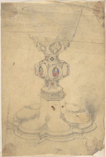 Editor: Here we have a drawing of a "Liturgical Incense Burner," dating from between 1850 and 1900, artist unknown, rendered with pencil, ink, and coloured pencil. The detailing is quite impressive, but there’s also something very tentative about the lines. What do you make of this work? Curator: It is, as you say, rich in detail. The draughtsman clearly understood the visual language of ecclesiastical metalwork. Observe how the verticality of the piece is carefully established. Note the rhythmic progression from the base, articulated with trefoil motifs, up through the bulbous node, culminating in the domed cover surmounted by a cross. It exemplifies a considered application of form. Editor: The different textures are intriguing. I mean, how the artist distinguishes between the smooth dome and the ornate base, using only line weight and minimal color. Curator: Indeed. The artist employs a calculated contrast between areas of dense cross-hatching, as seen on the base, and the relative spareness of the dome, constructed with fine, radiating lines. This differential treatment guides the eye, preventing the complexity from becoming visually overwhelming. Do you perceive any points of imbalance in the composition? Editor: Maybe a little at the top? The cross feels a bit… isolated. Curator: A fair observation. The cross, while structurally sound, lacks the visual weight to fully counter the elaborate base. This asymmetry introduces a subtle dynamism, preventing the drawing from becoming rigidly formal. This tension, inherent in the interplay of elements, is the essence of its aesthetic power. Editor: That's an interesting perspective. I initially saw it as slightly unfinished, but now I appreciate that imbalance and tension more. Curator: Artworks often yield deeper insights through focused observation of their compositional and material components. Such scrutiny allows us to move beyond initial impressions.