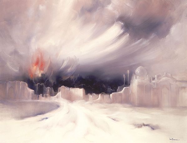 Editor: This is Iran Darroudi’s "Growing in this Way," painted in 1972. It's a pretty surreal landscape… I can't quite put my finger on the mood, but the red is so striking, almost violent. How do you interpret this work? Curator: The emotional weight is certainly palpable, isn’t it? Beyond the visual symbolism, I think we need to situate Darroudi within the socio-political context of 1970s Iran. Consider the pervasive sense of unrest and anticipation of change during that period. How might that anxiety and yearning for growth manifest itself symbolically in her surreal landscape? Editor: That’s a good point. I guess the “growing” element isn’t necessarily a peaceful growth. So, the sharp, almost harsh red and those vertical lines… are those bars? Curator: They could be interpreted as such. The "growing" may signify not only hope but also resistance. Are the "bars" structures of oppression? Are they symbols of confinement but also points of upward reach, aspiration? Consider how female Iranian artists at the time navigated their identities within a patriarchal society. Could this be a coded representation of their struggles and aspirations? Editor: I see, so it’s about a personal and political uprising, told through landscape. The abstract style almost hid that from me. Curator: Abstraction often becomes a vital tool for artists facing censorship or wishing to convey complex emotions that transcend literal representation. Think about how other women artists have used similar approaches to express complex social realities. Does that reading shift how you view the flower atop the central “bar”? Editor: It does. Before, it seemed delicate, but now it's resilient. A powerful statement about persisting in the face of oppression. I will have to dig deeper to contextualize the themes, symbolism and historical context of this era! Curator: Precisely! It enriches the experience, doesn’t it? The more context we gather, the more nuanced our appreciation becomes.