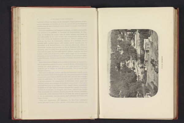 Curator: This albumen print, *Gezicht op Burg Eltz*, created before 1868 by Cundall & Fleming, captures a striking architectural landscape. The contrast is remarkable for the medium. Editor: It really does stand out, doesn't it? I’m struck by how this print is part of a bound book; the architecture of the castle mirroring that of the codex! How do you see the relationship between the photograph and the craft of bookmaking in this work? Curator: Precisely! Considering its materiality, we must remember albumen printing wasn’t merely a snapshot. It was labor-intensive. The egg whites used for the paper's coating, the chemical processes, the deliberate act of framing...these elements elevate the print beyond a simple image. Think of the class distinctions embedded in who could afford this process and consume this depiction of romanticized medieval life. Editor: That makes so much sense! So it's not just the image itself, but also the means of its production and who had access to it. This changes how I view it. How does this connection to production methods fit within the larger artistic landscape of the time? Curator: This photo romanticizes medieval strength even as industrial methods create it. It’s not hand-painted but carefully, painstakingly printed. Consider also that these albumen prints often end up in family albums, transforming monuments into a commodity for private viewing. Does knowing this affect your reading? Editor: Absolutely. It bridges the gap between this grand architecture and the intimate lives of those who could own such images, really making you think about accessibility and value, both artistic and monetary. I learned a lot looking through that materialist lens. Curator: Indeed, analyzing art through its means of production allows for richer insights. There's a certain tension created when a "timeless" castle is rendered through mass-producible photographic technology.