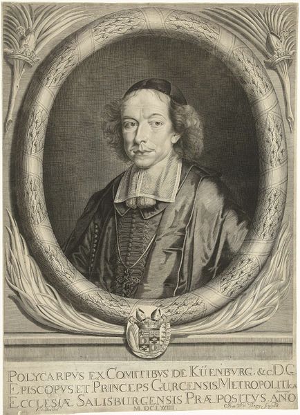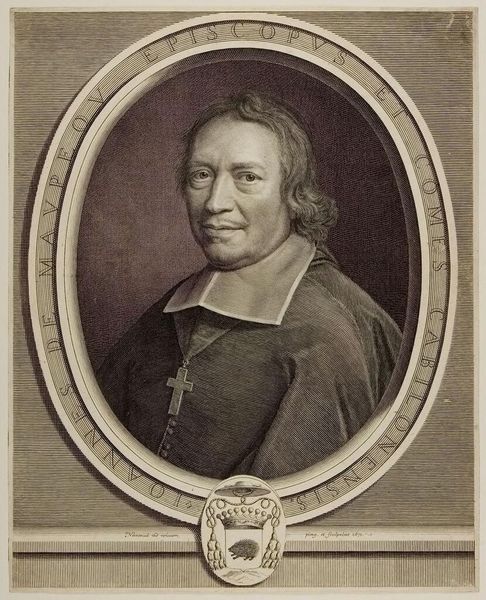 Curator: This is Robert Nanteuil’s portrait of Gilles Blondeau, likely created during Nanteuil’s lifetime in the 17th century. It’s a powerful image. Editor: Indeed. The oval frame lends a sense of formality, yet the sitter's gaze feels incredibly direct, almost challenging. Curator: Nanteuil was a master of engraving. Look at the precision of the lines, especially in rendering Blondeau's hair and the details of his clothing. Editor: Absolutely. And the heraldic emblem beneath the portrait adds another layer. It speaks to lineage, to a certain self-presentation, don't you think? Curator: I do. It’s like Nanteuil captured not just a likeness but also Blondeau’s very essence—his confidence, maybe a touch of world-weariness. Editor: A masterful piece, prompting reflections on identity, status, and the passage of time. Curator: One that lingers with you long after you’ve moved on, I think.