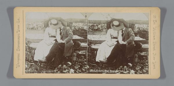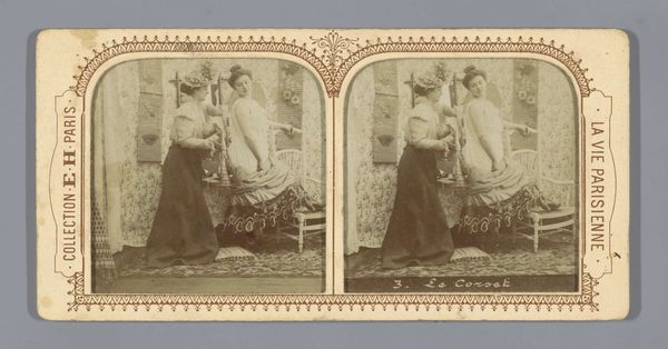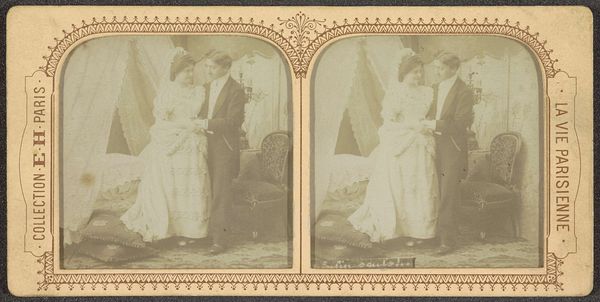 Curator: Here we have an interesting example of early photography entitled "Paar waarvan man in historische kleding," which translates to "Couple with man in historical clothing," dating from somewhere between 1860 and 1870 and attributed to Anatole Pougnet. What are your immediate impressions? Editor: My eye is drawn to the way the light falls across her dress. There's a beautiful gradation, almost sculptural in how it defines the folds of the fabric. The texture alone creates visual interest in what otherwise seems to be quite standard subject matter for its time. Curator: Indeed. Let's consider the means of production, though. This photograph was likely produced using the carte de visite format, small photographic prints mounted on card stock, a hugely popular and affordable medium during the mid-19th century. Its mass production is crucial for understanding its appeal to a wide range of consumers. The labor and consumption around these types of photographic portraits speak to new economies and material exchanges within French society. Editor: I see your point about democratization of portraiture through mass production; however, the aesthetic choices here are intriguing. The backdrop looks almost painted, blurring the lines between theatricality and reality. And the soft focus creates this wonderfully hazy, dreamlike quality overall, wouldn't you say? It leans toward Romantic ideals even with this modern process. Curator: Yes, and consider their staged costumes, perhaps hired for the occasion! What does it mean to *perform* historical identity, to partake in costumed reenactment within the rapidly shifting social landscapes of the time, when photography allowed these fictions to enter homes on affordable terms? This image hints at anxieties around the production of self, commodity, and class status during the early Second Empire period in France. Editor: That’s interesting. Though when you strip away the socio-historical dressing, I come back to the carefully constructed composition. The dark of his coat anchors the left side, creating this strong diagonal line that is balanced by her sweeping dress. The subtle gaze shared, that tender focal point...It speaks of more universal human conditions, like longing and the weight of social expectations. The artist made striking decisions. Curator: The material conditions enabled new forms of intimacy to circulate. But how are these notions of self, family and legacy caught within commodity forms? So, in this respect, can we read even that intimate glance outside structures of mass commercial appeal? Editor: Perhaps we meet somewhere in the middle— a tender moment made newly accessible as a reproducible format. I certainly see value in that combined view.