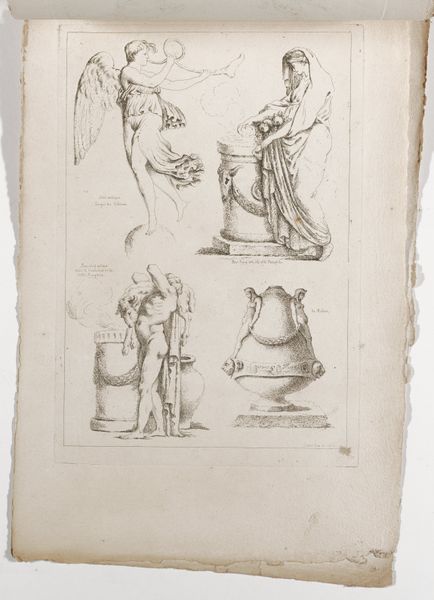 Curator: Oh, what a curious spread! Is this a page from a sketchbook, or maybe an encyclopedia? Editor: Indeed! We are looking at "Fascicule III," created in 1763 by Jean Claude Richard, Abbé de Saint-Non. It's an etching in ink on paper. Curator: It's fascinating how the artist compiled so many seemingly unrelated sketches onto one page. There's a figure hunched over what looks like a grindstone, various Grecian-style urns, even a goddess figure. There's almost an archaeological feel, like looking at fragmented memories. Editor: Yes, there’s a compilation aesthetic at play. Each vignette acts as its own study. Thinking about the etching process, the artist would've labored over each individual plate for the separate components. How might these individual studies have been combined? Curator: That's an interesting consideration... perhaps this piece reflects the artist's stream of consciousness, showcasing whatever subjects captured his fancy at the time. Maybe it echoes the cabinet of curiosities popular in the 18th century, compiling random items that represent something significant. Editor: And consider how widely disseminated prints like this would have been, and the types of patronage or audiences it appealed to. These detailed sketches are themselves commodities that could be circulated throughout the artistic landscape. Curator: Absolutely! Prints democratized art in a way never seen before. Thinking about that, it lends an interesting angle to those urns on the page—suddenly, they're not just objects d'art, but prototypes, mass-produced objects that were consumed by different tiers of patrons and the masses. Editor: A provocative reflection, I concur. This ink etching offers a window into not just artistic practice, but also systems of labor and consumption of aesthetic taste in 18th century Europe. Curator: It does! Each detail seems to invite an investigation. A fascinating journey that makes me question assumptions about art, beauty, and who gets to consume what. Editor: Precisely. The value isn't solely aesthetic—it’s bound to the historical record.