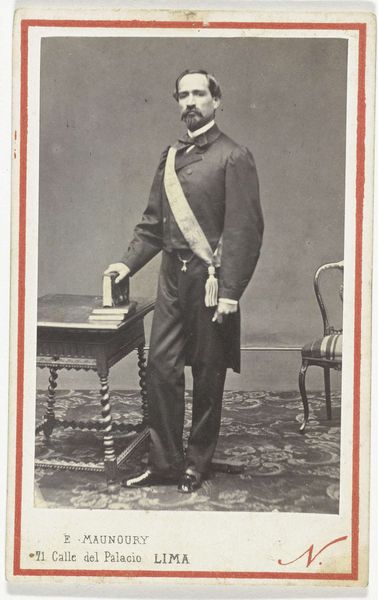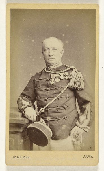 Curator: This gelatin silver print, an anonymous portrait of Hendrik van Mecklenburg-Schwerin, was likely captured sometime between 1900 and 1910. What strikes you initially? Editor: There's a rigid formality to it, isn't there? Every detail feels carefully constructed, almost stage-managed, but what's particularly noticeable is the way all his decorations call attention to his chest, his heart almost disappears underneath it all. Curator: Indeed. Let's consider how that formality is conveyed. We see elements characteristic of academic art – controlled lighting and meticulous detail, a sort of studied Neoclassicism evident in the composition. What meaning do you derive from that rigidity? Editor: Well, portraits of this kind served very specific social functions. It's an image deeply entrenched in turn-of-the-century ideas about class and lineage. Note the accoutrements and decor: these were the tools by which class and privilege announced and reproduced themselves, and in the photograph's focus on Hendrik's royal regalia, you have an endorsement of all these mechanisms. Curator: Absolutely. And if we think about the material conditions of photography itself at this time, the relative accessibility of the medium enabled the proliferation of these types of images – cementing a shared understanding of how power presented itself. You see how this mode of communication further enshrined Hendrik as an almost mythological figure. Consider, too, the tonal range – limited and lending a somewhat ghostly air. Editor: Right, the photograph seems to invite veneration. The slight blur around the edges gives Hendrik an air of timelessness. What an uncanny way of seeing him so thoroughly adorned – we're seeing symbols of empire, the iconography of aristocratic Europe in all its finery! Curator: It provides a window into a very specific cultural moment. We can appreciate the portrait's visual structure, but also consider it as a document reflecting the complex social dynamics of the early 20th century. Editor: Exactly. It is about far more than what he literally wears; it tells of all that supported it and all who went without. It really puts things into perspective.
