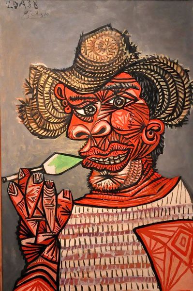 This is Picasso's "Man with Straw Hat", painted with oils probably sometime mid-century. The hat is like a halo, constructed with these vibrant blue strokes, looping round and round, like thoughts circling a head. The application is uneven and blotchy, particularly on the face, like he's building up features, not describing them, and that bright orange area, right of the hat, it sort of grounds the darkness, like we're looking at him in the night. It's a little like the late Philip Guston, who also used these odd angles and planes to create forms. Look how the fingers are just roughly blocked in, the paint thin here, but there's such a life to it all, it's not overworked, it's like a sketch, immediate and honest. Picasso is a master of the form, but he's not afraid to show us the process, like it's not about perfection, it's about feeling.