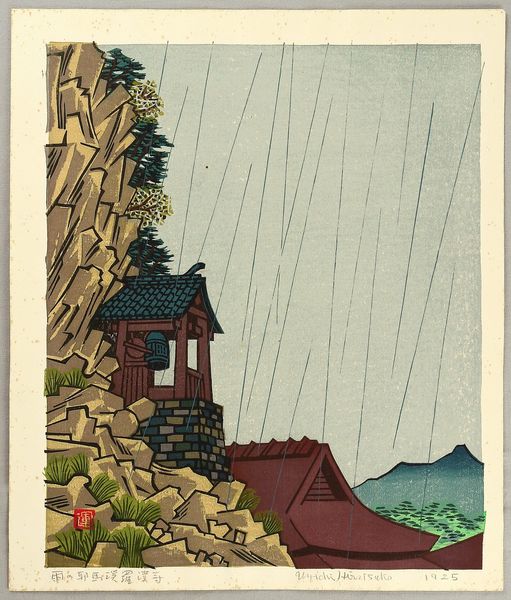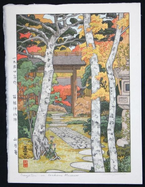 Editor: This woodblock print, titled "Autumn in Hakone Museum," was created in 1954 by Toshi Yoshida. I’m immediately struck by the blend of natural landscape and structured garden elements. It evokes such a serene feeling...what draws your eye in this piece? Curator: The interplay between the built environment and nature speaks volumes about post-war Japan and its relationship with tradition. Yoshida, working in a time of rapid modernization, revisits the ukiyo-e tradition but filters it through a contemporary lens. How do you perceive the way the museum, ostensibly a container of culture, is framed within this landscape? Editor: That's interesting...it does seem intentional. Almost like a reminder of our place in a larger context. It’s not just showcasing art *inside* but positioning art *within* a larger cultural and natural framework. Curator: Precisely. Ukiyo-e prints often depicted scenes of leisure and everyday life, making them accessible to a wide audience. Here, though, what societal narratives do you think Yoshida might be exploring by representing this very manicured space of culture, available primarily to those who could afford it? Editor: I guess it is prompting a consideration of access and privilege, something I hadn’t picked up on initially. It's interesting to consider how the image might be read differently depending on the viewer’s position in society. Curator: Indeed. Yoshida doesn’t shy away from subtly weaving in these tensions, prompting viewers to consider the complex relationship between art, nature, and the social order. It really asks: who gets to experience this carefully constructed idea of 'nature'? Editor: I see! I was so focused on the aesthetic beauty, but understanding the cultural context really deepens my appreciation. Thanks for making me think about the public role of art! Curator: My pleasure! Looking closer unveils just how potent art can be when considered within its socio-historical backdrop.
