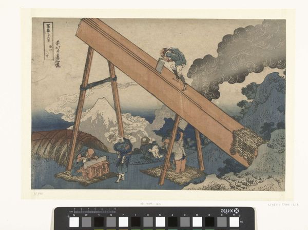 "In the Mountains of Tōtōmi Province" was made by Katsushika Hokusai using woodblock printing techniques. Hokusai lived during the Edo period when Japan’s economy was growing and woodblock prints became very popular among common people, who traveled to see famous landscapes. This print is part of a series called "Thirty-six Views of Mount Fuji." This series reflects not only the reverence for Mt. Fuji, but also the lives of ordinary people. Here, Hokusai pictures laborers sawing planks of wood. The print emphasizes their physical exertion as they move and work to sustain their community, and it also gives us a sense of the period's class structure, where the working class was vital to society. The almost abstract composition, with its large wooden planks against the backdrop of the iconic Mount Fuji, invites you to reflect on the relationship between human labor and the natural world. The way Hokusai depicts this scene suggests a deep respect for both the mountain's grandeur and the human effort required to transform its resources.