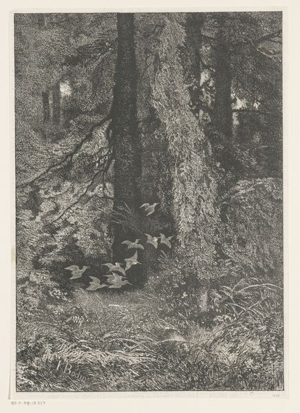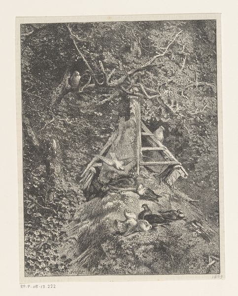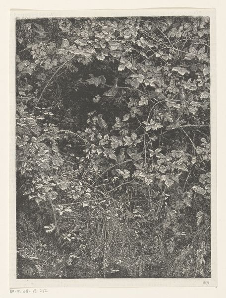 Editor: This is "Fox in the Thicket" by Karl Bodmer, from 1868. It looks like a pencil drawing. It's quite detailed, and I'm immediately struck by how hidden the fox is within the dense foliage. What do you see in this piece? Curator: I see more than just a fox concealed in a thicket. This piece, created during a period of intense social and political change across Europe, seems to resonate with themes of marginalization and the struggle for visibility. Editor: Marginalization? Curator: Absolutely. Consider the fox. It is traditionally seen as a figure of cunning and trickery, often existing on the periphery of human society, isn't it? Now place that within the context of the late 19th century. We’re talking about rapid urbanization, industrialization, and the displacement of rural populations. Doesn’t the fox, half-hidden and trying to navigate this thicket, echo the plight of marginalized communities striving to survive within increasingly complex social structures? Editor: That's an interesting point. I hadn't considered the social context of the piece so explicitly. So, the thicket itself could be seen as a metaphor? Curator: Precisely. The thicket becomes a representation of societal barriers, the dense and often impenetrable systems that keep certain groups hidden, their voices unheard. Bodmer’s choice of such detailed linework adds to the sense of overwhelming complexity. Where does the individual end and the system begin? Editor: I'm starting to see the drawing in a completely new light. I originally just saw a fox hiding. Curator: It's about moving beyond the surface. We must contextualize and examine the intersectional layers of meaning. Editor: I’ll definitely be more aware of the historical context from now on. Thanks for broadening my perspective. Curator: My pleasure. Let's always ask: who is being seen and who is being obscured, and what structures create that reality?