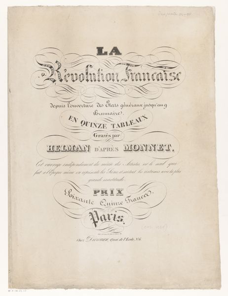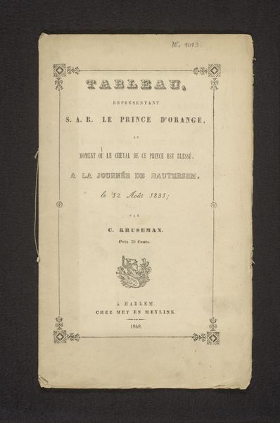 Curator: What we have here is the cover for a set of lithographs, “Omslag voor zes prenten met landschappen met dieren,” dating from 1835. The artist credited is Théodore Fourmois. Editor: My first thought? Elegant restraint. The typography has these delicate swirls and the border feels like it’s whispering, not shouting. It feels so controlled. Curator: Controlled is an interesting word choice. Formally, yes. Notice the geometric border sharply contrasts with the calligraphy inside. The print's rigid structure emphasizes the Romaticism's need for self-imposed constraint. Editor: It's funny you mention that. Romanticism is about letting yourself go, and yet, everything's in neat alignment. All those swashes and flourishes corralled into that very severe rectangular frame! What a great conversation. Curator: The contrast underscores the subject matter, six idyllic landscapes promised inside. Imagine escaping from 19th century city life to stroll in these scenes of pastures. A true retreat. The lithographic process lends itself so well to replicating tonal variation. Editor: The details practically disappear as I get further back! Did they intend for it to be viewed closely, or did these images live inside books or folios where you wouldn't be right on top of them? Curator: Considering this is the cover, that level of detail must have been considered. The subtleties of tone and texture likely beckoned potential buyers closer, promising something special within. I would argue that there is a commercial motivation driving aesthetic choices. Editor: Absolutely. It’s a beautiful artifact, in every sense of the word. It really makes you appreciate the hand and skill behind a printed image, it feels artisanal. Curator: An exceptional piece, isn’t it? It holds such a captivating interplay between rigidity and organic expression.