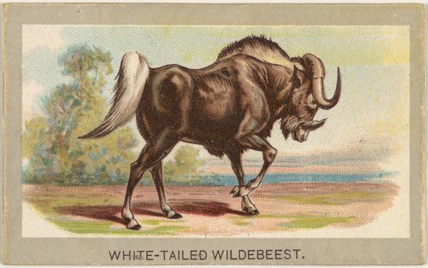 Curator: I am immediately struck by this bison's quiet stoicism, set against that pale sunset sky. It exudes a serene strength that's deeply appealing, like an old soul just hanging out. Editor: Today we’re observing "American Bison," from the Animals of the World series (T180), created around 1881, issued by Abdul Cigarettes. It resides here at the Metropolitan Museum of Art. This drawing, likely a coloured pencil print, situates itself within broader historical narratives around American expansionism, the construction of wilderness, and the decimation of indigenous populations intricately linked with the bison's fate. Curator: That's quite a heavy historical load for a little picture on a cigarette card to bear, but I see your point. Knowing that it was printed around 1881 makes that placid gaze feel…complicated. It's not just a bison; it is a loaded symbol in a contested landscape. I find myself wondering if this specific animal perhaps escaped wholesale slaughter or maybe it didn't. Editor: Absolutely, this artwork—ostensibly an innocuous piece of advertisement— functions as a microcosm of prevailing attitudes. It reinforces the colonial gaze, framing the bison as an exotic commodity against a receding frontier landscape. Curator: Thinking about that colonial gaze…did the folks smoking these cigarettes think about how they're puffing away while an entire ecosystem—a way of life—went up in smoke, too? There is something disquieting when viewed from today's standpoint. Editor: Right, examining the materials through which these images circulated brings forward those questions around agency, ownership, and representation. Curator: Well, suddenly that "serene strength" feels more like forced resignation, doesn’t it? Makes you think about all the unspoken stories packed into these mass-produced objects. Editor: Exactly. Its function in relation to our ongoing discussions surrounding environmental justice, indigenous rights, and historical memory must not be dismissed. Curator: It definitely leaves me contemplating how seemingly innocent images can mask deep-seated power dynamics. Thanks, I see that poor bison in a different light now, loaded but more interesting than when we started, to be sure. Editor: Yes, even a simple image like this asks us to consider its place within larger societal structures. An unexpectedly evocative and challenging object!