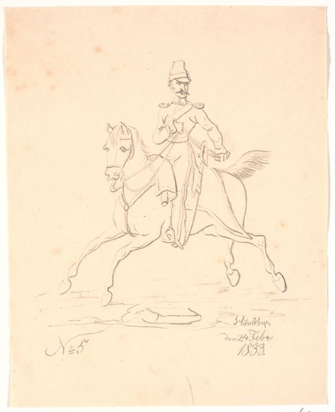 Johan Thomas Lundbye sketched 'Riding Soldier Leading an Unsaddled Horse' with graphite on paper in 1833. The artist used the most simple of means to create the drawing, but the final appearance of the artwork is dependent on the qualities of the graphite and paper he chose. The texture of the paper influences the graphite particles' ability to adhere to it, creating a rough and somewhat uneven line, as can be seen in the horses' manes. Lundbye expertly harnesses the potential of line work and hatching to create depth in the depicted scene. The drawing captures a moment of military life, reflecting Lundbye's interest in Danish folk life. But beyond its subject matter, it showcases Lundbye's skills as a draughtsman. The artist’s ability to evoke movement and detail with just a few lines underscores how much can be achieved even with the most rudimentary materials and techniques.