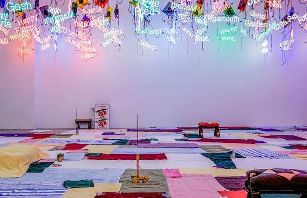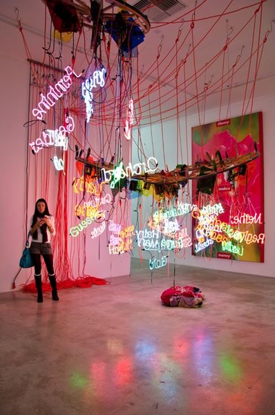 Editor: Jason Rhoades's "Untitled" from 2004, using mixed media and installation. The first thing I notice is the jumble of materials; it feels chaotic yet somehow contained. What materials stand out to you and what’s their purpose in this artwork? Curator: For me, this work is an overt examination of artistic production itself. Consider the visible armature of pipes: it literally frames and supports not only the aesthetic object, but the entire mode of art-making. Note also how neon—typically signaling commercialism—is repurposed, hand-made, even somewhat crude in its application. Rhoades collapses hierarchies; there's no pretense of elevated artistry. How might this deliberate 'messiness' challenge our notions of value and skill in the art world? Editor: It’s interesting to think of the neon words as almost mass-produced, yet each one feels individually crafted with its own imperfections. It seems to blur the line between industrial output and personal creation. Does the presence of the couch imply something about labor, too? Curator: Absolutely. The couch implicates the viewer and evokes the potential for leisure, but in this context, it seems more connected to labor: the 'work' of relaxation, the exhaustion *after* production. Furthermore, that it's clearly a manufactured, not handmade, object suggests a commentary on commodification – even of our rest and mental space. What does the orange cabling tell us? Editor: They definitely guide my eye but also suggest how much raw, physical effort went into the wiring; the innards exposed instead of hidden. So much for aesthetic mystery. Curator: Precisely. There's no obscuring the labor; Rhoades forces us to acknowledge the social and material conditions under which art is created and consumed. It encourages us to rethink what constitutes “art” beyond mere visual appeal. Editor: That’s really changed my perspective! I initially saw it as messy and overwhelming, but now I see how deliberate that choice is in challenging conventional ideas of what art should be and what making art entails. Curator: Indeed! It makes one question the values of labor, the systems of production and commercialism involved in even the seemingly most individual expression.