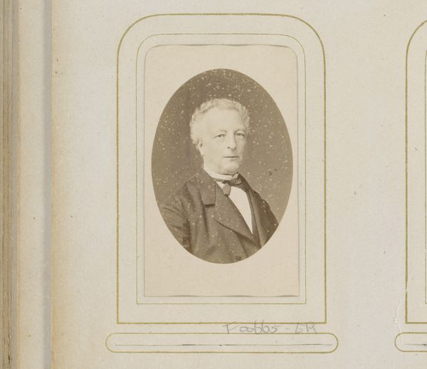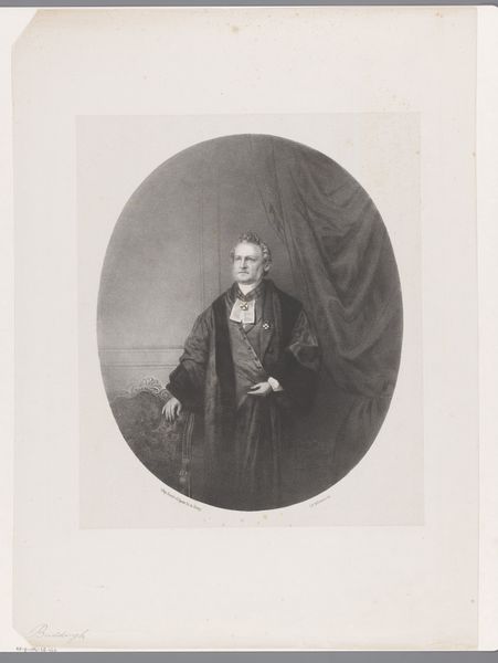 Curator: This is a pencil drawing created in 1852 by Willem Frederik Wehmeyer. It's entitled "Portret van Abraham des Amorie van der Hoeven." Editor: The immediate impression is one of starkness. The subject, encased in that dark oval, seems both imposing and slightly vulnerable. The grey scale enforces a sense of seriousness and distance. Curator: Let’s consider Wehmeyer's choice of medium. Pencil drawings were incredibly accessible in the mid-19th century, making portraiture achievable for a wider segment of the middle class, both as artists and subjects. Editor: Precisely. The almost photographic realism is intriguing given that photography was emerging. It feels almost a conscious aesthetic choice. The line work is delicate, creating depth, texture. Note how the lines on the suit imply a stiff fabric and construct depth? Curator: The sitter, Abraham des Amorie van der Hoeven, was a prominent theologian. Consider how the relatively accessible nature of drawing democratizes portraiture. It brings images of people like van der Hoeven, and by extension their ideas, to a broader public. The multiplication of images matters! Editor: Yet, the overall composition retains classical portrait conventions. Look at the pyramidal form of the figure, its containment within the oval. The symmetry of his expression, only broken slightly by that one spot in the lower right. It roots itself in established notions of dignified representation, despite the ‘common’ medium. Curator: Agreed. While it employs a relatively ‘common’ material, this image serves to reproduce and disseminate the image of someone like van der Hoeven to a broader public and also communicate values associated with status in this period. This speaks to its broader cultural impact and that reproduction. Editor: So, we have both access and formality, technique and status presented through a restricted range. Interesting constraints. The pencil, seemingly simple, becomes a powerful mediator in portraying status and likeness. Curator: Indeed, thinking about this work has shown how closely material choices can become wrapped up in constructing and distributing power in society. Editor: And how effective, despite the limited resources. I find myself impressed by the possibilities held within such limitations.