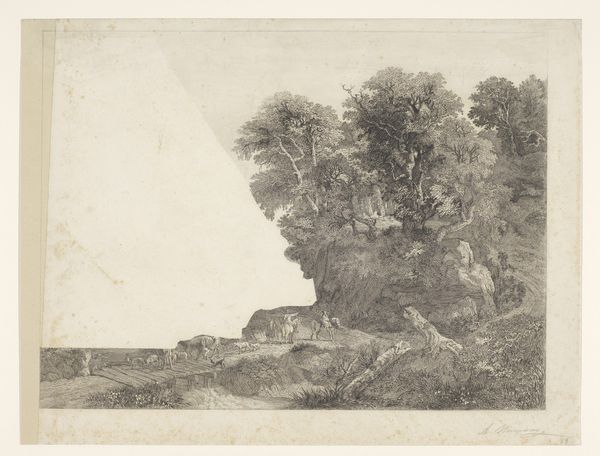 Paul Huet made this print titled 'Near Fontainebleau', using etching, a technique that lends itself to capturing the subtleties of light and shadow. The trees here command our attention. In ancient cultures, trees were symbols of life and knowledge, and their appearance in art can evoke powerful emotions. The prominence of nature in this artwork invites us to reflect on the deep connection humans have with the natural world. You will find the veneration of trees in countless depictions of the Garden of Eden or the World Tree Yggdrasil, and their symbolic associations extend into the realms of life and death, decay and rebirth. Artists throughout time return to these archetypes to convey ideas that resonate within us all. As you gaze upon this quiet scene, remember the timeless cycle of images, their ability to transcend time, and their enduring impact on our collective memory.