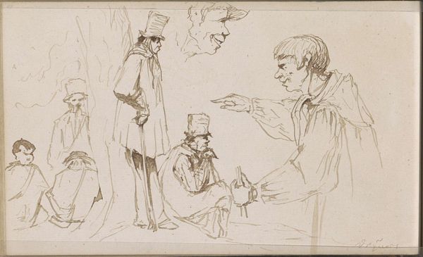 Editor: This is "Studies of Old Men" by Eduardo Rosales Martínez at the Harvard Art Museums. It's a quick sketch, almost like a doodle, but there's something so striking about their stooped postures. What can you tell me about this work? Curator: These rapid sketches offer a glimpse into the artist's process. Rosales was a Spanish painter deeply influenced by the social realism movement. Do you think these men, perhaps studies for a larger work, represent the marginal figures in the rapidly modernizing Spain of his time? Editor: That's interesting! I hadn't considered the social context. So, it's not just an observation of old age, but a commentary? Curator: Precisely. The political climate shaped artistic expression. Rosales would have been very aware of how these images would be read by the public and within the art establishment. Editor: It definitely adds a layer of meaning. Thanks! Curator: My pleasure. Considering the political context always enriches our understanding.
