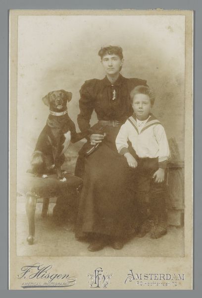 Curator: Well, here we have "Portret van een onbekende vrouw met twee kinderen en een hond," a gelatin-silver print that probably hails from somewhere between 1892 and 1902. The photographer was J.C. van der List. It’s got a wistful air to it, wouldn’t you say? Editor: It does indeed! There’s something in their gazes. It's so formally posed, yet the mood feels strangely unguarded. The dog almost seems the most present, the most alive in the frame. Is that melancholia I sense or something else? Curator: Maybe it’s the light…or the backdrop, which seems almost hand-painted and just a little blurry. The softness gives it a very intimate, dreamlike quality. I keep returning to that dog; is it a symbol of loyalty? Editor: It's undoubtedly meant to represent fidelity, domestic harmony, yes, the "faithful friend." It's an earthly counterpoint to the heavenly idea of motherhood presented by the woman and her two children, a subtle connection. Consider, too, the way they're arranged: a pyramidal composition anchoring the subjects together. Even the boy’s hand resting on his mother’s shoulder hints at continuity, generations. Curator: But does that domestic tableau fully succeed? Look closely— the boy's gaze is confident and knowing, yet his sister avoids your eye completely. Do you think that hints at unspoken stories? Editor: Absolutely. What’s omitted always intrigues more than what’s explicitly shown. Consider the stark formality of their attire. It underscores both social standing and societal expectations placed on this maternal figure. Motherhood wasn’t a role; it was a performance, meticulously curated, isn’t it always the case? The picture provides evidence and simultaneously shrouds the lived reality of women during that period. Curator: That tension, between representation and the unrepresented, is what really makes the piece, then. And the photograph becomes a cultural artifact rather than merely a sentimental family portrait. The staging opens doors for the cultural history and the symbols reveal individual nuances. Editor: Precisely. It prompts a reconsideration of both then and now.