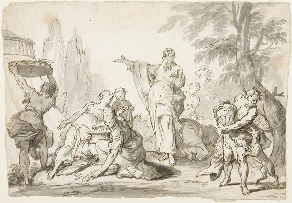 Curator: This etching by Laurent de La Hyre is called "Holy Family Served by Angels (with the overturned basket)". It is part of the collection at the Harvard Art Museums. Editor: It's incredibly lively. The mass of cherubic figures creates a sense of overflowing abundance. Curator: De La Hyre frequently employed allegorical and mythological figures to represent abstract ideas like peace and prosperity, which could explain the visual choice of overwhelming abundance. Here, the angels represent divine provision, reinforcing the idea of the Holy Family being cared for by God. Editor: It's a fascinating juxtaposition. The idealized scene of domesticity is disrupted by the chaotic activity of the angels. One might wonder if it touches on the social roles assigned to women. Curator: Perhaps, but there’s also a symbolic reading, considering the overturned basket and the offering of fruit. It could symbolize earthly abundance being offered to the divine family. Editor: That's a compelling interpretation. The overturned basket can be read as a symbol of generosity and the willingness to share worldly goods. Curator: Ultimately, the image resonates because it visualizes the idea of divine blessing being tangible and accessible. Editor: I see it more as the disruption of the divine sphere into human experience. It's a lovely bit of chaos, really.