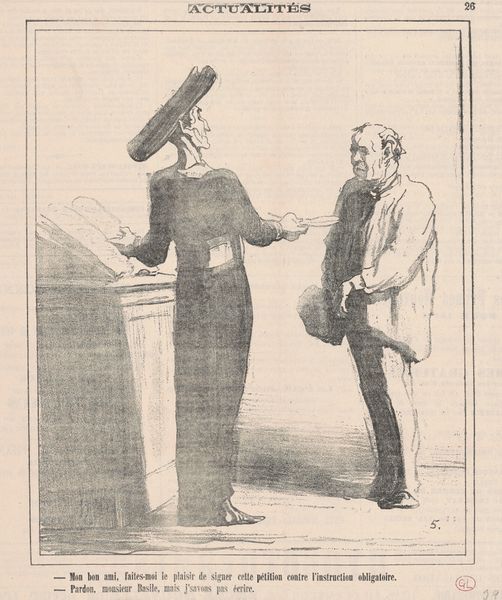 This lithograph, "Knock and it shall be opened unto you," was created by Honoré Daumier in 1850 for the French publication, Actualités. Daumier was known for his satirical commentary on French society and politics. Here, we see a caricature of a woman, presumably Madame Elisabeth de Hogrie, knocking on the door of the Académie Française with a book under her arm, presumably of her own writing. The Académie Française, historically an exclusive all-male institution, served as the official authority on the French language. Daumier’s caricature critiques the social and gender barriers within the French literary establishment. We see class and gender intertwining in his depiction, which highlights the struggle for recognition faced by women in the male-dominated world of arts and letters. The woman's determined expression contrasts with the closed door, evoking a sense of exclusion. The image compels us to reflect on the ways in which cultural institutions reinforce or challenge existing societal hierarchies, reminding us of the ongoing struggle for equality and representation.