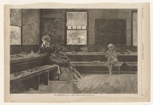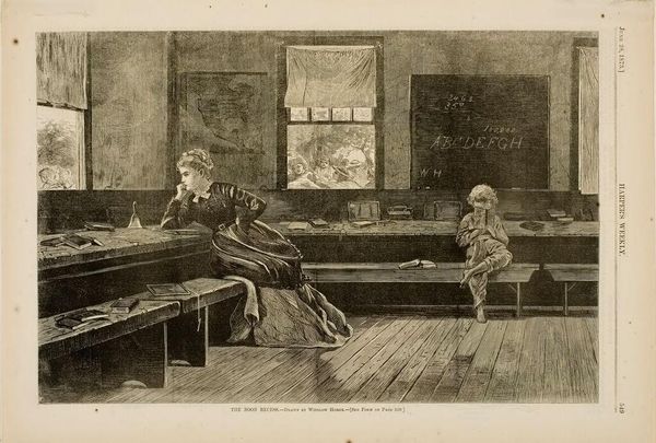 Curator: Winslow Homer's "The Noon Recess," published in Harper's Weekly in 1873, is a fascinating snapshot of 19th-century American life. It’s an engraving that provides so much context for understanding societal structures of the period. Editor: You know, my first thought seeing this—besides feeling a sudden urge to scratch chalk on a board—is just how incredibly lonely it feels. Curator: Yes, that solitary atmosphere really permeates the scene. Consider the representation of the female schoolteacher and the male student against the backdrop of the social conditions after the Civil War. The work encapsulates themes related to gender and educational access during that time. Editor: Right, you’ve got her stuck in this pose, almost like she’s guarding her domain, or perhaps stuck in thought while observing that wild gaggle of kids causing havoc outside! The lone barefoot boy seems pensive, apart from her as well, each in their little universe during what’s supposed to be a break. It's almost suffocating. Curator: And let's not ignore the loaded gazes exchanged—or, perhaps, *not* exchanged. Power dynamics are encoded through pose, placement, even the items carefully arranged on desks or held in hands. Who is allowed leisure and reflection, and at what cost? We must ask who profits and who is silenced here. Editor: Gosh, now that you say it... There’s something slightly sinister about those kids. Like they know something we don’t! Maybe they know how miserable school will make that solitary little dude! Sorry, getting carried away, it really just hits you hard. It’s deceptively simple but so intense! Curator: Indeed, the genius is that tension between simplicity of scene and depth of meaning. By considering this piece within an intersectional framework, it opens up layers regarding labor, childhood, gender roles, and the mythologies of nationhood and educational systems still operative today. Editor: Definitely gives you the feels! Thanks for shining that light on it; all I know is Homer totally nailed the human condition, and he sure can make an atmosphere. Now I'm feeling inspired…or maybe just need a recess!