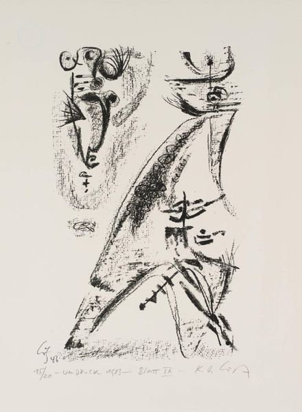 Curator: Before us, we have Marc Chagall's "Painter with Palette," created in 1952, employing ink as its primary medium, resulting in a print that blends figuration and expressionism. Editor: It feels intensely personal. Raw. Almost unfinished, yet it exudes confidence. The figures, particularly the artist himself, possess a striking, almost haunting quality. Curator: Absolutely. And when we consider Chagall’s own history, the consistent exploration of his Jewish identity and experiences of displacement following persecution, the self-portrait here reads as both a personal declaration and a more politically charged expression of identity. We see the nude figure, perhaps representing vulnerability or authenticity, positioned intimately with the artist, highlighting the complexities of creative expression within fraught social contexts. Editor: From a material perspective, the choice of ink is significant. It lends itself to spontaneity. Looking at the visible marks, the artist has applied the materials without laboring over them, revealing a connection to a deeper subconscious or instinctual state, where ideas become material objects swiftly. The sparse use of color acts as almost like another material. Curator: Precisely. Color becomes more than just a visual element, acting instead as another form of symbolism. Blue evokes spirituality, the nude a form of truth and exposing the vulnerability needed to be able to produce such expression. He paints a vision of being at work that goes deeper than studio. It is mental, historical, it requires that kind of bravery. Editor: I’d add, look closely, and you'll find more than just expressionism; the use of print techniques situates the artist within a long lineage of producers making this kind of subject accessible across geographical contexts and socioeconomic barriers, democratising these radical ways of representing self, history and culture. Curator: That’s such an insightful perspective to introduce, especially now when considering representation within contemporary settings. Chagall’s works allows for deeper discussion on how we understand these subjects and our own placement within that narrative. Editor: Indeed, a perfect example of how focusing on an artist's choice of medium reveals deeper understandings about our modern perspectives and assumptions towards historical expression.