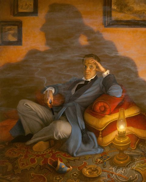 Editor: This is Michael Cheval’s “Cloud Tailor,” painted in 2018 using oils. The composition is certainly thought-provoking, juxtaposing the grandness of a cloud-like fabric with the mundane task of tailoring. It's strangely intimate. What do you make of this seemingly bizarre, yet intriguing scene? Curator: Oh, I love how Cheval spins the ordinary into the utterly fantastic! The gentleman, a tailor seemingly ripped from a period drama, hunches over his work as this ethereal figure models the fabric. It feels like a meditation on the creative process itself, doesn't it? Imagine the sky as your atelier, the clouds as raw material waiting to be shaped. He’s not just sewing cloth; he’s capturing dreams, stitching moments of fleeting beauty. Don’t you feel a sense of yearning in this picture? Editor: Absolutely. There's a contrast between the romantic idea of cloud tailoring and the grounded, almost melancholic figure of the tailor. The props—tea kettle, wine—lend this domestic air. It’s dreamlike, but… real. What’s that about? Curator: Reality and dreams, or better still, surrealism and realism here coexist in perfect, strange harmony. This interplay suggests art-making as the convergence of fantasy and craft, of inspiration and, let’s be honest, a bit of tedious work! I wonder, are we all, in some ways, tailors of our own clouds? Editor: That’s beautiful, stitching together our realities! It transforms the mundane act into something much more meaningful and resonant. Curator: Indeed, and isn't that the enchantment of Cheval’s work? We unravel threads of familiarity only to discover a canvas woven with imagination and delightful absurdity. It leaves us delightfully altered.
