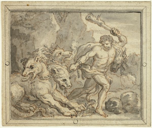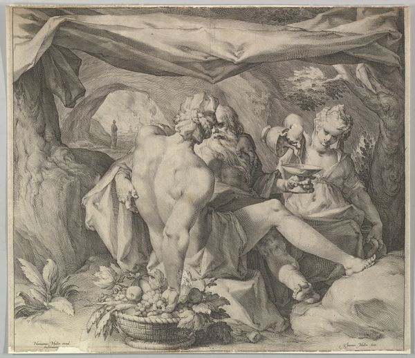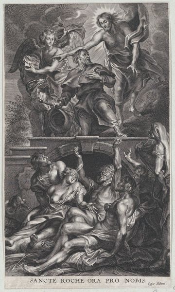 This is an anonymous print of 'Saint Peter Released from Prison', rendered in reddish-brown ink on paper. The scene is dominated by the figure of Saint Peter, who appears startled yet hopeful. The artist uses line and form to create a dramatic contrast between the saint and his surroundings. The composition is structured to draw your eye upward, from the sleeping guards to the angel gesturing towards freedom. The use of a single hue unifies the composition, yet subtle variations in tone create depth and texture. Note how the lines etching the stone walls are sharply defined to highlight the confinement, in opposition to the soft rendering of the angel's body and wings. This contrast emphasizes the divine intervention breaking through the physical constraints, a visual manifestation of the liberation narrative. The dynamic lines and strategic use of light and shadow convey the disruption of the prison's static environment by a higher power. This print is not just an illustration of a biblical event, but a study in how form can embody themes of deliverance and spiritual awakening.