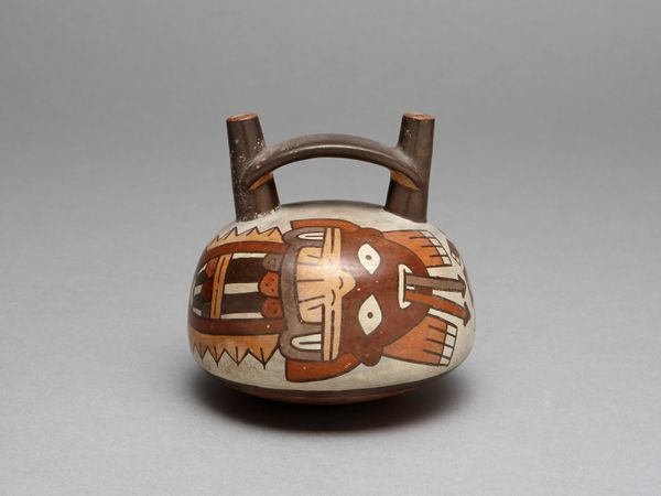 This is a ceramic vessel depicting a costumed ritual performer wearing a feline mask, created by the Nazca people of ancient Peru. Considered a precious item, this vessel was made to hold liquids, perhaps water, or chicha, a type of corn beer, and was likely used in religious ceremonies. The feline mask on the figure represented here, with its large eyes and pointed ears, was a symbol of power, and would have been worn by high-ranking members of society. Through these ritual performances, individuals sought to connect with the supernatural world. The Nazca people, who lived in the arid coastal region of Peru, had a deep understanding of their environment. Their ability to thrive depended on their understanding of the cycles of nature. Here, the imagery evokes a world where humans and animals are interchangeable, and where ritual performance was a way to ensure the fertility of the land. The vessel offers us a glimpse into the beliefs and practices of a society that saw the world as a place of constant exchange between the human, natural, and supernatural realms.