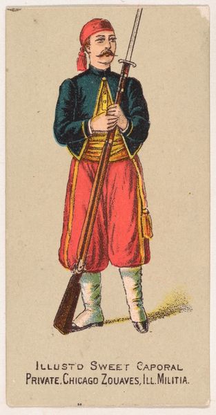 Curator: Let's talk about "Infantry, Spain, 1886," a piece from the Military Series, circa 1888. It was actually produced by the Kinney Tobacco Company as a promotional item for their Sweet Caporal Cigarettes. Editor: It strikes me immediately as oddly romantic. He has such an earnest, if slightly world-weary, look in his eyes. Is it meant to glorify military service, or subtly critique it? Curator: In its historical context, such series played into the era's jingoistic sentiments. Think about the late 19th century; it was a time of intense nationalism and colonial expansion. Images like this, mass-produced and widely circulated, certainly contributed to a climate of patriotic fervor. Editor: But see how he grips the rifle—not with aggression, but almost protectively? And the soft color palette… the faded blues and reds speak of nostalgia, maybe a yearning for a past glory, more than outright celebration of warfare. Even the pose suggests quiet reflection. Is he more symbolic than representative? Curator: That's an interesting interpretation. These images, distributed with tobacco products, were meant to be collected, traded, and admired. It was really about branding, using historical or exotic military figures to associate a sense of adventure and sophistication with the Sweet Caporal brand. There is even an "academic art" undertone to the series. Editor: It is a product of empire. That's undeniable. However, consider the semiotics. The soldier’s attire, specifically the red trousers, are visually dominant and are symbols of bravery, sacrifice, and historical narrative. He holds these inherent cultural implications within him. They add depth beyond a simple advertisement. Curator: That raises a key point about the nature of images in popular culture. Even when designed for a specific purpose like marketing, they inevitably become embedded in broader social and cultural narratives. Editor: Precisely. He becomes a vessel filled with all the cultural implications of Spain, soldiery, and duty in the modern era. It all blends in a dizzying symbolic swirl, which I feel may be missed if we view the subject too broadly. Curator: Well, seeing how that military fashion would likely become outdated pretty soon, Kinney Brothers Tobacco surely understood the appeal of presenting timeless "academic art" pieces as collectables with their products. A clever, but very common way to drive commerce. Editor: And in a strange way, that also helps him maintain the ability to hold the multiple meanings we are giving him today. He manages to still invite a sense of both critical study and reflective reverence in the viewer. Curator: An unlikely survival. I agree. Editor: A perfect example of layered cultural baggage—for better and worse!