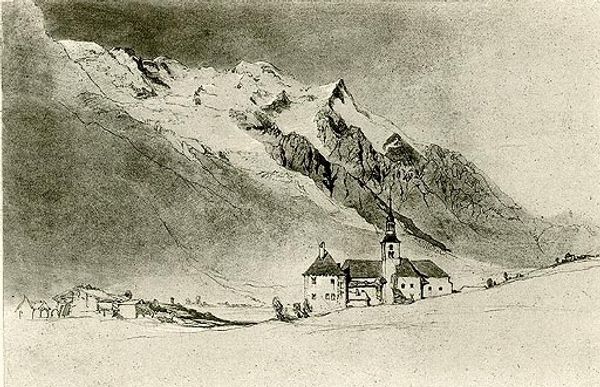 Curator: Looking at Theodor Kittelsen's drawing from 1900, called "She Is Making Her Way Through the Country," the immediate sensation is…wintry melancholy. Don’t you think? Editor: Certainly the limited palette contributes to that somber tone, but the textures really jump out at me. The rough strokes describing the thatched roofs, the dense scrub – you can almost feel the chill and the dampness involved in the making. Curator: Absolutely. It's a harsh landscape. But the central figure, almost cloaked in shadow, carries such weight, doesn't she? It makes you wonder about her story, her resilience amidst this… elemental struggle. It's pure Nordic soul, if you ask me, like an Ibsen play distilled into ink. Editor: I'm struck by the labor implied in every aspect, even in the land. Building and maintaining those turf structures, even sketching such intricate details—it highlights a daily grind rooted in specific skills and locally sourced materials. Did he create preliminary sketches outdoors, or work solely from memory, I wonder? Curator: Knowing Kittelsen's affinity for folklore and the personification of nature, I wouldn't be surprised if he imagined the landscape itself as alive, perhaps seeing the woman as an embodiment of the land’s enduring spirit. Editor: Or maybe he intended for us to consider that this landscape is entirely dependent upon human labor to maintain it. The way the materials are displayed is really interesting and it leads me to believe there are political elements that would not have been visible at that time. Curator: Political? Intriguing! I suppose that adds another layer to this solitary journey; not just personal but perhaps emblematic of societal shifts and struggles as well. She feels like a shadow… and perhaps more. Editor: The choice of drawing also suggests a readily accessible and reproducible method – a departure from grand oil paintings of the elite and gentry. Drawing enables one to portray any class dynamic one wishes and so can serve the message that way as well. Curator: In the end, it leaves you contemplating not just what we see, but what we carry with us as we move through our own landscapes, literal and metaphorical. Editor: Right, both her literal labor and our own cognitive labor, as the viewers engaging with both materials and Kittelsen’s message.