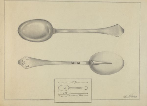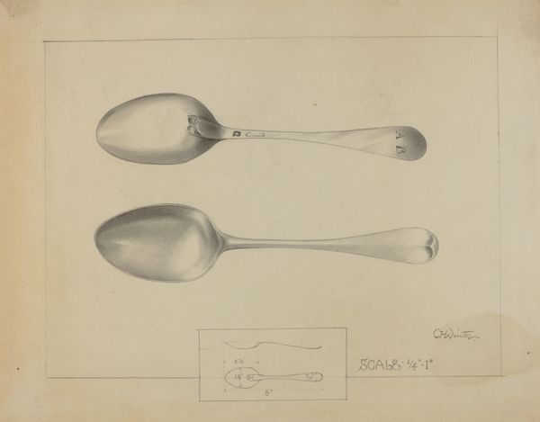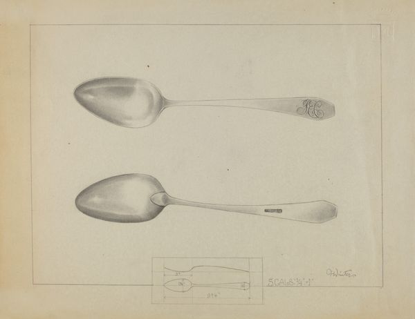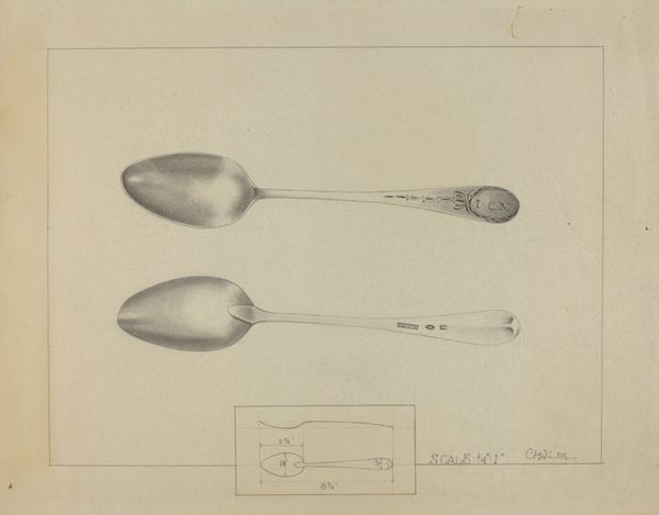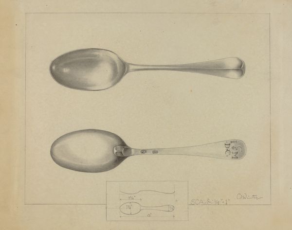 Curator: Well, hello there! Looking at Charlotte Winter's "Silver Spoon," dating to around 1936, brings me back to simpler times. Editor: It’s the pencil and charcoal for me. Stark, elegant, and undeniably focused. Almost feels like a blueprint, meticulously planned. Curator: Precisely! I find this piece compelling precisely because of its potential use as a utilitarian blueprint of some sort. One might almost imagine an architect making designs on it. Editor: Indeed. It is the strategic deployment of shading that is really the core of it. Consider the ways Winter has captured the spoon’s rounded form. A study in pure light and shadow, you could say. Curator: Absolutely. We must also take note of the context within which Winter was creating. This drawing may offer us glimpses into questions of consumption. To have silverware would suggest one came from means, after all. Editor: Certainly, the drawing doesn't shy away from the stark contrasts between utility and beauty. I love the details. The monogram, for instance; but it's the minimalist details around the scoop itself. Very satisfying in their geometry. Curator: True. In reality, however, a spoon, however beautiful, serves a material function. Who did the spoon belong to? Is it meant to evoke larger concerns of class? There are indeed many questions a piece like this may inspire! Editor: An astute point. To me, this artwork succeeds through the stark contrast. And through it's elegant forms and strategic contrasts that a sort of dialogue takes place between reality and a sort of higher realm, something so intrinsic. Curator: Yes, an everyday object imbued with so much story through line and perspective. The banality of it becomes very striking in retrospect. Editor: Quite. The power of minimalism really lets you in in this case, and really makes a statement. I find myself thinking I may never look at silverware quite the same way again.