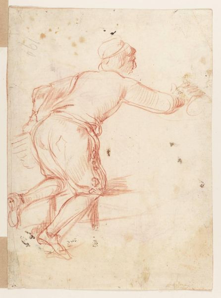 Editor: This is Jan Steen's "Study of a Man Playing Skittles," from around 1650 to 1655. It’s a pencil drawing on paper, currently held at the Rijksmuseum. There's something almost frozen about the action, and the monochrome pencil sketch creates an effect that reminds me of early photography... What strikes you about this piece? Curator: What immediately comes to mind is how seemingly simple scenes like this were actually deeply embedded in the socio-political fabric of 17th-century Netherlands. While it presents itself as a genre painting – a snapshot of everyday life – Steen's choice of skittles taps into something much larger. Games of skill like skittles weren't just innocent pastimes. Editor: What do you mean? Curator: Well, consider who had the leisure time and social standing to engage in such activities publicly. The painting offers insight into gender roles, class dynamics, and even moral attitudes. It suggests privilege, doesn't it? How does it resonate with you regarding power dynamics of the time? Editor: That's fascinating. I guess I was initially drawn to the image's simplicity and almost casual feel. I hadn’t considered the power dynamics it might reflect. Curator: And isn't that the beauty of art? To draw you in with familiarity, only to challenge your preconceptions. What begins as an unassuming drawing unveils these complex threads. How different is it when compared to leisure scenes today? Editor: Definitely a new perspective for me, I appreciate you connecting the drawing to broader issues of class and society, I’ll definitely be looking at Dutch Golden Age paintings in a different light now. Curator: That is what Art history and visual culture are for!