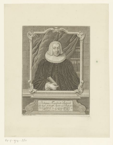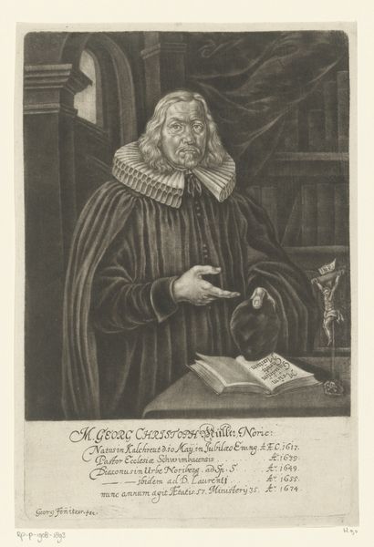 This engraving of Sigismund Faber at the age of 70, was created by Johann Friedrich Fleischberger. The portrait presents Faber in a distinguished manner, his face etched with fine lines that speak to age and experience. Fleischberger masterfully uses line and texture to create depth. Faber's garments, rendered in meticulous detail, contrast with the smoother surfaces of his face, drawing attention to his intellectual presence. Note how the lines of the ruff lead the eye directly to Faber's face, underscoring the importance of the individual. The visual structure creates a semiotic field, where the book, the face, and the textual inscriptions combine to convey Faber's identity as a man of learning and faith. The overall composition is rigidly structured, reflecting the religious order. Yet, within this order, the artist captures a sense of Faber's personal character and intellect, suggesting a play between institutional role and individual identity.