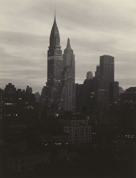 Curator: Looking at Alfred Stieglitz's "From My Window at An American Place, Southwest," created in 1932, all I feel is this almost haunting loneliness, like I'm spying on a sleeping city. Does it hit you that way too? Editor: Initially, yes, a muted and melancholic key. But look at how Stieglitz organizes the frame. The dark, imposing buildings in the foreground act as a kind of aperture, directing our gaze. There’s a sophisticated use of tonal contrast that establishes depth. Curator: "Sophisticated," yes, but there’s more! It feels like he's not just showing us buildings but the breath of the city itself, all this potential held back by a gray sky. Like waiting for something to burst, maybe hope, or just...more grey? Editor: I concur; that nuanced, emotive quality can’t be discounted. This was taken during the Depression era, after all. The uncompleted skyscraper hints at a sense of unfulfilled promise—the ambition of industry curtailed by economic hardship. Consider that in the context of Stieglitz's previous symbolist work with cloud studies; here, urban structures take on symbolic weight. Curator: Right, these are not just photos of buildings; they're portraits of a mood. This one in particular has that almost desperate feeling of watching, hoping that somehow, despite everything, things will look up... quite literally toward that grey sky. The precision mixed with feeling gives this photo so much character. It really pulls at the imagination, doesn't it? Editor: Absolutely, and the beauty of this lies in its composition: how he’s converted emotion and societal mood into line, contrast, and structure. This structured presentation of complex sentiment through urban portraiture, rather than through symbolic artifice alone, is Stieglitz’s genius. Curator: Indeed, genius seems a fit way to capture Stieglitz’s vision; now that our brief, hopefully inspiring journey looking through Stieglitz's window is complete, let’s take another look ourselves.