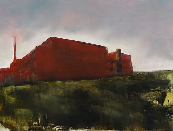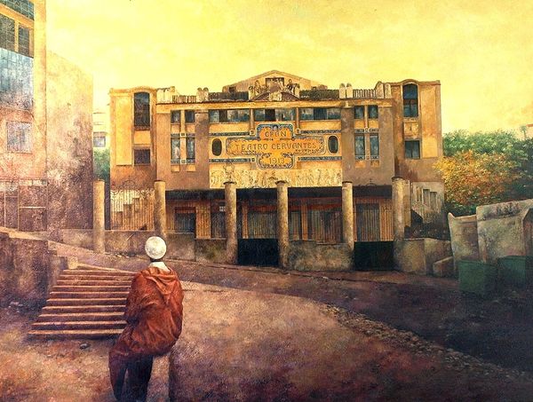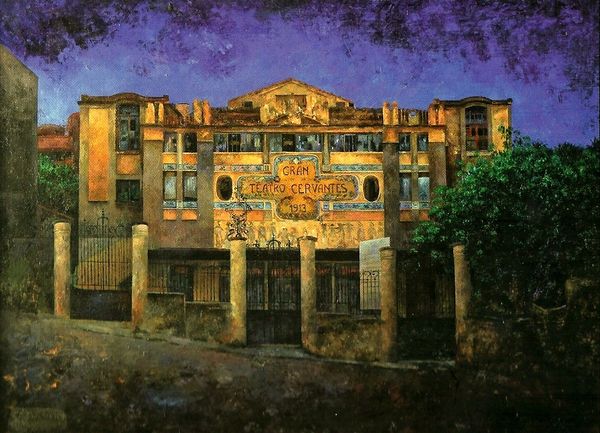 Editor: Here we have Consuelo Hernández's "Winter in the Gran Teatro Cervantes of Tanger," an oil painting from 2011. The somber palette and abandoned atmosphere create a rather melancholic mood, at least to me. What stands out to you, what visual relationships do you see in this piece? Curator: Initially, the eye is drawn to the contrast between the imposing architectural structure and the muted, almost desaturated, color palette. Note the architectural composition—how the horizontal emphasis of the theater is disrupted by the vertical thrust of the adjacent tower. The use of a predominantly analogous color scheme, varying tints and shades of similar hues, contributes to the somber mood. Do you notice how the textures play a vital role in the painting? Editor: Yes, the way the paint is applied, especially on the building, gives it this incredible sense of age and weathering. It makes me wonder if the rough textures mirror a sense of decay. What do you think about the stark white statue juxtaposed with the colors used in the background of the work? Curator: Observe that the statue serves as a focal point, drawing the viewer into the scene. However, its cool white hue clashes rather pointedly with the warmer, earthier tones of the architecture. This disruption causes tension within the composition, doesn't it? Note that it may reflect a struggle between classical ideals and the deterioration of modern realities. This stark color difference enhances the psychological weight. Do you perceive the connection that Hernandez made in her brushwork? Editor: I see, the colors seem almost discordant but in a way that highlights the theater's wear. Considering the structure, I think I’m starting to understand the balance, and maybe conflict, between the colors, shapes, and textures that you highlighted earlier. Thank you. Curator: It is rewarding to dissect these visual elements and explore the dialogue the artist initiates through her compositional choices. The intrinsic aesthetic considerations provide a richer viewing experience.