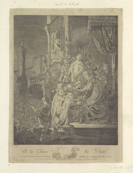 Curator: This is "Christ before Pilate," an intaglio print created between 1854 and 1858 by Bisson Frères, currently housed here at the Rijksmuseum. The toned paper lends it a sense of age, doesn't it? Editor: It does. My first impression is of a scene caught between light and shadow, literally and figuratively. A visual manifestation of moral ambiguity, I would say. Curator: Absolutely. Bisson Frères have captured a pivotal biblical scene using the cool detachment of Academic Art, but also injected it with aspects of realism. Editor: And through that combination, the drama unfolds in a way that feels both historical and very, very human. It's compelling to think about the artists presenting such a scene in the mid-19th century, and what message this would bring in Europe. Curator: That's an excellent point. Remember that mid-19th-century audiences were highly literate in biblical imagery. Here, the contrast between the figure of Christ, illuminated yet restrained, and Pilate, enveloped in shadow but holding power, is strikingly depicted in compositional balance. Pilate, representative of the power structure. Editor: And that visual symbolism would've resonated. Power, authority, justice… or the lack thereof. This moment of judgement plays heavily into our culture and continues in our time. What does "justice" really mean when decisions are made at this scale? Curator: This intaglio allows us to see how this historic encounter gets imprinted onto our cultural memory. Each stroke of the engraving becomes a layer of interpretation through time, re-examining a foundational story of Western society and power structures. Editor: So much is evoked in this single print, making the moment palpable for us even today. I leave thinking less about Christ or Pilate, but of us - who stands where in that composition, and how will that be read in time? Curator: Precisely, Bisson Frères captured a moment ripe with endless interpretation, leaving the question of power and judgment hanging in the air.