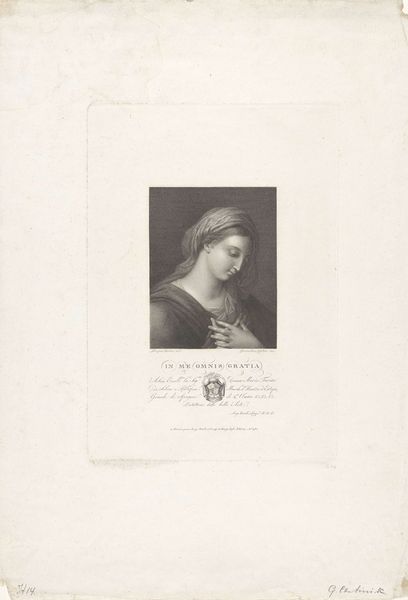 Editor: So, this is "Young Woman from Florence" by Léopold Flameng, created in 1863. It's an etching, ink on paper… and it strikes me as a rather conventional portrait at first glance. How do you approach this piece? Curator: From a materialist perspective, it’s interesting to consider printmaking within a wider social and economic framework. Think about it: prints democratized art. It allowed for broader consumption. This wasn’t a unique, hand-painted image for a wealthy patron, but a reproducible commodity. Editor: That makes sense. So, how does the process of etching, specifically, inform our understanding? Curator: Etching involves a highly skilled labour process; a copper plate meticulously worked to create the image. But etching also meant these images became available to a wider, possibly middle-class, audience who might not otherwise have access to art. This introduces interesting questions about artistic value, labour and the changing function of art itself in the 19th century. Where does craftsmanship meet mass production? Editor: So the choice of materials and production has social and political implications. Did the academic art world embrace it, or resist this? Curator: The academic world both benefited from and critiqued it, fostering a hierarchical structure between original artwork and reproductive prints. Editor: Fascinating. I had viewed it merely as an aesthetically pleasing portrait. Now, thinking of the print as a multiple, it flips my original assessment. Curator: Exactly. Shifting the focus from subject to production really illuminates its place within 19th-century society. Editor: Definitely gives me a lot to consider in terms of production's impact and cultural reach! Thank you.