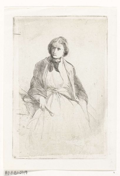 This is Joan Berg's delicate etching, "Portret van Freule Berg zittend op stoel". Berg, who lived from 1851 to 1935, captured this portrait with a fine, observant eye. The sitter, "Freule," a Dutch title of nobility, embodies the social status of the time. Consider the gaze of the woman in the portrait, the subtle way she holds herself; does it suggest a quiet confidence or something more complex? Berg, as a female artist in the late 19th and early 20th centuries, was navigating a world where women's roles in art were often limited. Berg's work invites us to reflect on the dynamics of gender and class during a period of significant social change. What does it mean to portray a woman of nobility through the eyes of a female artist? The work prompts us to consider how identity shapes perception, both in art and in life.