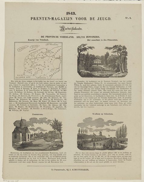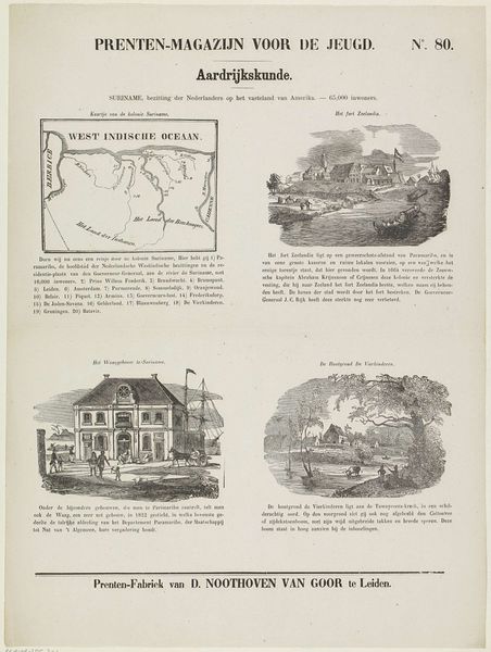 Curator: Let's turn our attention to this fascinating engraving entitled "Suriname, bezitting der Nederlanders op het vastland van Amerika - 65,000 inwoners" or, "Suriname, possession of the Netherlands on the mainland of America - 65,000 inhabitants." It was created in 1845 by Jan Schuitemaker. Editor: My first impression is how ordered it feels, almost like a page torn from a geography textbook. But the small details of the scenes, like the figures, they seem weighed down by something more than simple depiction. Curator: Schuitemaker, a publisher and printer based in Purmerende, created this image as part of a series for children, using engraving. Note the way it combines a map with depictions of key locations: Fort Zeelandia, the weigh house in Suriname, and Vierkinderen. Editor: It’s that stark contrast that grabs me. The seemingly innocent intention of educating youth masks a complex narrative of colonialism. The neat layout contrasts sharply with the implied human cost – the dispossession of indigenous populations and the horrors of the plantation system. Even at this distance, these landscapes are stained with those histories. Curator: The imagery draws heavily on established visual tropes. The map itself asserts a European claim over the territory. But even within that framework, the images carry certain emotional weights. The fort for instance, as a sign of power and dominance… Editor: Exactly! It speaks to how knowledge was wielded as a tool of empire. Showing these scenes, the fort, the government buildings, implies a benevolent Dutch presence. It's as if they are educating the children on the glory, ignoring what that "glory" was founded upon. Curator: This work is part of the period that promoted specific versions of knowledge that we must revisit. Editor: Indeed. Schuitemaker's engraving acts as a reminder: representations of place and people were anything but neutral, always participating in existing relations of power and ideological reinforcement. Even a print created for children, a space supposedly removed from overt political agenda, still operates as a critical historical document about a very troubled chapter in Dutch colonial expansion.