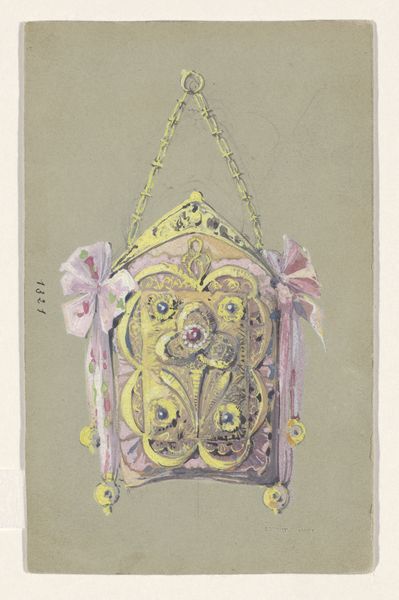 Editor: This is Paul Louchet's "Design for a Pendant with a Woman with Dragonfly Wings, of Gold, Rubies, Opals, and Enamel" from around 1905. The delicacy of the watercolour illustration gives me a feeling of yearning and ephemeral beauty. How do you interpret this work? Curator: It whispers of dreams, doesn't it? Louchet masterfully embodies the Art Nouveau spirit here. The feminine form intertwined with the dragonfly – symbolising transformation and lightness – is archetypal. What intrigues me is how it flirts with a slightly darker, melancholic sensibility, a common thread in late Romanticism that bleeds into the early 20th century. Do you see how the opals hint at teardrops, anchoring the flight of fantasy with earthly weight? Editor: I do see that! It makes the whole piece a little bittersweet. The Pre-Raphaelites also loved these sad, dreamy figures, right? Curator: Absolutely. Louchet is drawing from a similar well, steeped in mythology, with a strong sense of craftsmanship. I wonder, do you get a sense of its potential scale from this design? Can you imagine it being grand and imposing, or more intimate? Editor: I picture it being smaller, precious… worn close to the heart. Looking at it again, the woman seems more resigned than joyous. Almost weighed down by the jewels surrounding her. Curator: Precisely! It is a reminder that beauty often carries a trace of sorrow within it, and it has opened a perspective that reveals much to us. Editor: This has opened my eyes to the darker, bittersweet elements within such pieces, where the line between beauty and sadness blurs so poetically. Curator: Indeed. It shows that even the most beautiful fantasy can carry the weight of reality.