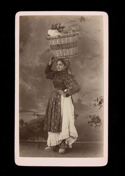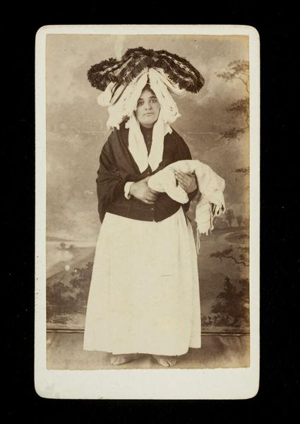 Editor: This photograph by A.J. Rapozo, titled "Costumes of Michaelenses, Azores, Portugal," depicts two figures in enveloping capes and hoods. The muted tones and obscured faces create a rather mysterious atmosphere. What do you see in terms of the formal elements at play? Curator: Observe how the artist employs the voluminous shapes of the capes and hoods to dominate the composition. The geometric form creates a striking contrast with the delicate bouquet. How do the lines and forms guide the viewer's eye? Editor: The converging lines of the capes lead the eye to the center, to the flowers. I hadn't noticed that before. Curator: Exactly. The artist's strategic manipulation of form generates visual interest and underscores the focal point. A fascinating study in the power of shape. Editor: It is amazing to consider that simple forms and shapes can create such an enigmatic image.