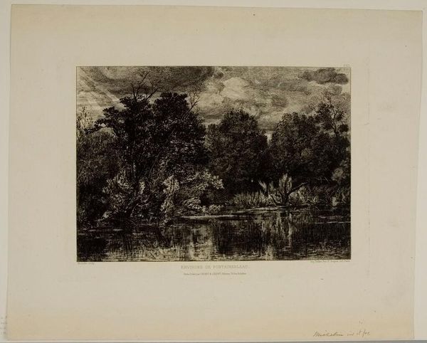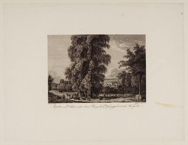 Curator: This is William Byrne's "Abingdon from the Thames Navigation," a landscape print offering a glimpse into late 18th-century England. Editor: My immediate reaction is to the monochromatic palette. The shades create a tranquil, almost melancholic mood. Curator: Notice how Byrne uses the spire of St. Helen's Church. It serves as a visual anchor, referencing spiritual stability amidst societal change. Editor: The composition is cleverly structured. See how the trees on the left frame the view, and the horizontal lines of the river lead the eye towards the town. Curator: Absolutely. The river itself has always been a powerful symbol of life and flow, a pathway for trade and cultural exchange. Editor: Indeed. And the contrast between the detailed foreground and the softer background adds depth and interest to the image. Curator: Ultimately, this print is a reflection on the relationship between people and the landscape. Editor: It's a reminder of the beauty and serenity that can be found in simple forms, even within a limited tonal range. Curator: Precisely. It provides a moment of contemplation and connection across time. Editor: A subtle yet powerful expression of place.