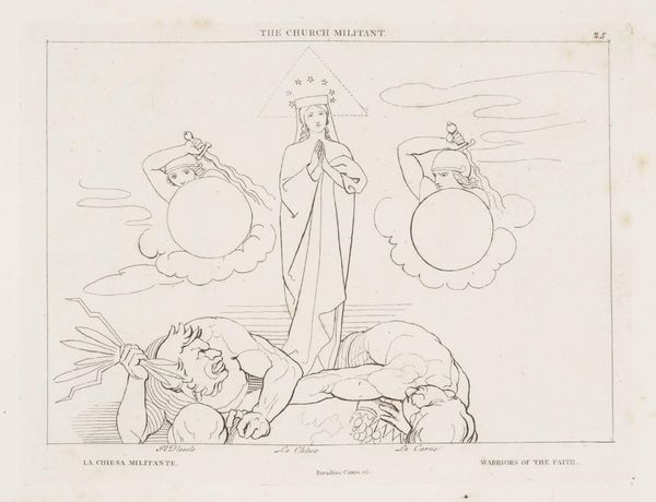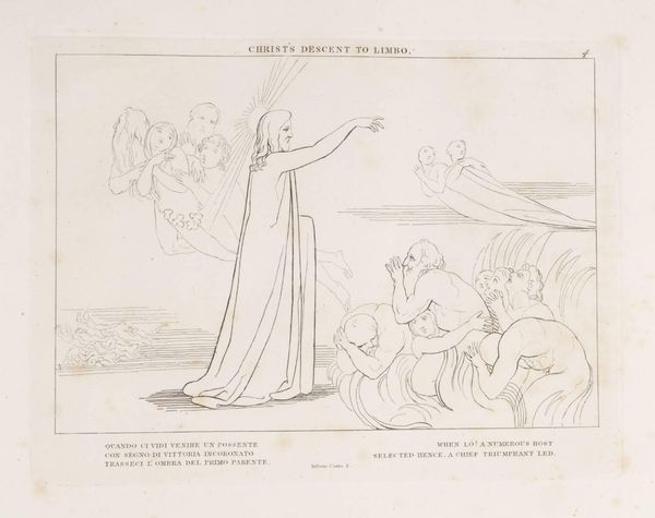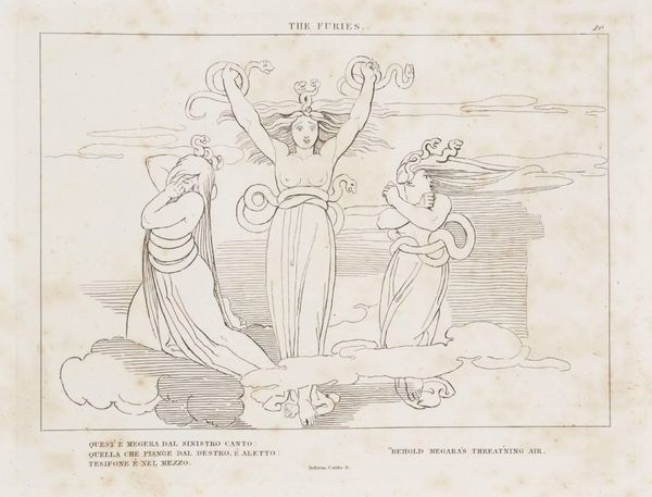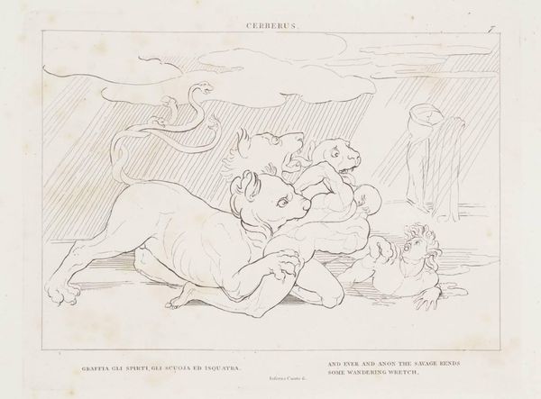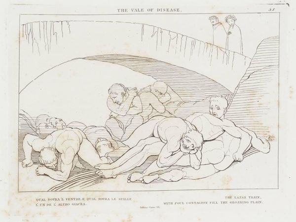 Curator: This spare drawing, held in the Tate Collections, is titled "The Lake of Pitch" by John Flaxman. What strikes you initially? Editor: It's stark. The figures are so vulnerable, caught in what appears to be a very brutal scene. Is this meant to represent some form of punishment? Curator: Precisely. Flaxman created these illustrations inspired by Dante's *Inferno*, so it’s about sin and divine retribution. These figures are immersed in the lake of pitch, tormented for their earthly transgressions. The composition makes clear the power dynamics at play. Editor: So the lack of embellishment—the simplicity of the line—actually heightens the sense of raw emotion and suffering. It almost feels performative, a public shaming. Curator: I agree, and understanding the social and religious context certainly enriches our interpretation. The focus on the body as a site of both pleasure and pain is incredibly relevant to contemporary discussions around control. Editor: Flaxman's interpretation definitely leaves a lasting impression. Curator: Indeed, a potent visual translation of Dante's vision.