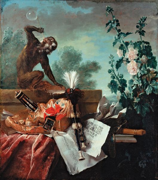 Editor: Here we have Gerrit Dou's "Still Life with a Boy Blowing Soap Bubbles," painted in 1636. The use of oil on panel gives the painting a luminous quality, but the inclusion of a skull in the upper right really gives this Dutch Golden Age painting a sense of melancholy. What's your take on it? Curator: Melancholy, yes, but also a rather touching meditation on time and innocence. Notice how Dou contrasts the ephemeral nature of soap bubbles—that childhood pastime—with symbols of mortality, like the skull and the hourglass tucked behind. It's a Dutch tradition called "vanitas," reminding us of life's brevity. And what of the boy’s gaze directed upwards? Editor: It does look like he is reaching for something beyond... Does that expression tie into the "vanitas" theme as well? Curator: Absolutely. His upward gaze hints at aspirations, dreams perhaps, contrasted with the fleeting moment. The light seems to embrace him, almost highlighting his innocence before life's realities settle in. It’s like a stage, isn’t it? One prop leads to another, creating a beautiful, thoughtful display. I see each object has its symbolic voice and its presence— almost a poem. Editor: A visual poem! It's interesting how these objects together express a deeper meaning beyond just the surface, even a child blowing bubbles can say so much about life's journey. Curator: Precisely! And that’s what makes art like this timeless, still inspiring conversations after all these centuries.