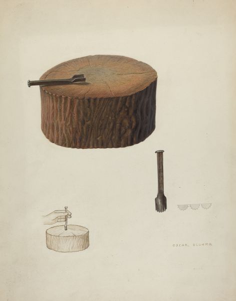 Curator: First impressions? For me, this rendering of a wooden butter churn evokes a sense of quiet, rustic simplicity... it feels… comforting. Editor: Comforting, yes, but also incredibly loaded. This object whispers of labor, of gendered divisions, of the romanticized rural past obscuring some very real hardships. Let's unpack this “comfort,” shall we? Curator: Absolutely! What we're looking at is Clyde L. Cheney's watercolor and drawing of a "Wooden Churn," made sometime between 1935 and 1942. It’s a straightforward depiction—academic style, very clean lines. But like you said, there's so much churning beneath the surface. Editor: Indeed. Cheney created this image amidst the Great Depression, a time when notions of self-sufficiency and traditional domestic roles were heavily emphasized. Butter churning itself was typically a woman's task, tied to ideas of domestic virtue and sustenance. This wasn't just making butter; it was performing femininity. Curator: You're right, it's easy to miss those layers. I love the way Cheney captures the textures—the weathered wood, the tight hoops. But now I see it as a kind of quiet monument to labor. Did he idealize that labor? Possibly. Editor: And who benefited from that idealization? Think about the power dynamics embedded in rural life at the time, the often-unacknowledged contributions of women and marginalized communities. The "churn" becomes a symbol of constrained opportunity, of bodies dedicated to repetitive tasks. Curator: It certainly reframes my initial impression. It’s interesting how a simple, almost nostalgic image can contain so much complexity. Editor: Precisely. And isn't that the point? Art invites us to look closer, to question our assumptions. Curator: To acknowledge the hard work—and, yes, the constraints—behind even the simplest pleasures. Editor: And to consider the hands that held the dasher, the stories that have been obscured by time and nostalgia. It’s never just about the churn, is it?