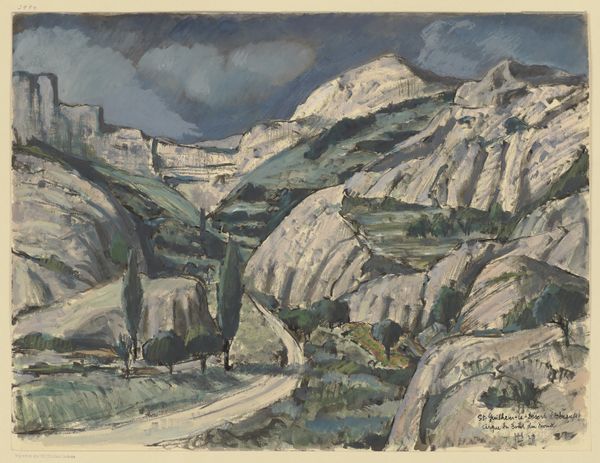 Editor: This is Hermann Lismann's "San Marino," painted in 1924, using watercolor on paper. The dramatic, almost looming presence of the fortress really strikes me. How do you interpret this work, especially given its historical context? Curator: I see a fascinating intersection of power, landscape, and identity being explored here. The imposing fortress, rendered in those stark, almost militaristic grays, can be interpreted as a symbol of entrenched power. But what does that power mean in the context of 1924, a period marked by post-war anxieties and rising nationalisms? Editor: That’s interesting. So, you're suggesting it might be more than just a pretty picture of a historic site? Curator: Absolutely. Consider the Expressionist style; it's not just about accurately depicting the scene, but about conveying a feeling, an emotional state. Lismann might be using San Marino, a symbol of historical sovereignty, to comment on the fragility and the burdens of national identity in a rapidly changing world. The landscape, almost overwhelmed by the fortress, could represent the people subjected to its power. Editor: The 'burden' of identity… I hadn’t considered that. Do you think his choice of watercolor is significant too? It feels delicate compared to the weighty subject matter. Curator: Precisely! The delicate watercolor could represent the vulnerability, the precariousness of that power, hinting at the potential for change, for the landscape – the people – to eventually erode the dominance of the fortress. Think about how often historically the grandest fortifications ultimately crumble. Editor: I see your point. So, it's not just a cityscape; it's a commentary on power dynamics. Curator: Yes, and on how historical symbols are never neutral, especially in times of great social and political upheaval. Hopefully viewers come away from this not just appreciating aesthetic execution, but also pondering about these lasting dynamics that are present across cultures and continents. Editor: This has really changed my perception of the artwork. Thank you. I will definitely keep those factors in mind going forward. Curator: My pleasure. It is about embracing diverse layers of thought and constantly re-evaluating the world.